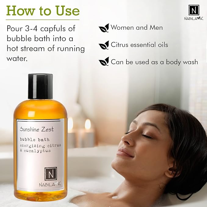 Sunshine Zest Bubble Bath with Citrus & Eucalyptus Scent by Nabila K - Essential Oils with Natural Ingredients for Sensitive Skin, Tear-Free, Gentle, Moisturizing - Luxury for Women & Men, 8 oz