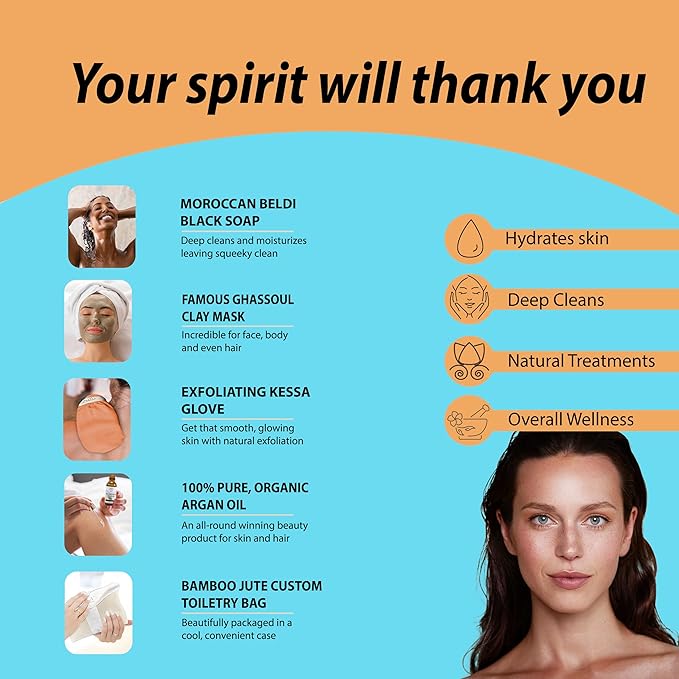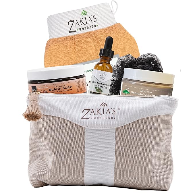 Zakia's Morocco Moroccan Hammam Spa Rejuvinating Ritual Beauty Skincare Kit - Four steps, Six Piece Set for purifying, toning, cleansing, and exfoliating for every skin type_AMBER MUSK