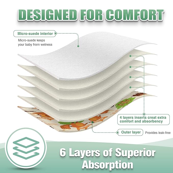 - Absorbent and Soft Insert: Inserts are made of 4 layers fibre, the strong absorbent material with breathability and softness is gentle on your baby’s bottom, keep your baby comfortable and happy; The inner suede cloth touches baby, and wicks moisture away from baby's bottom to the insert