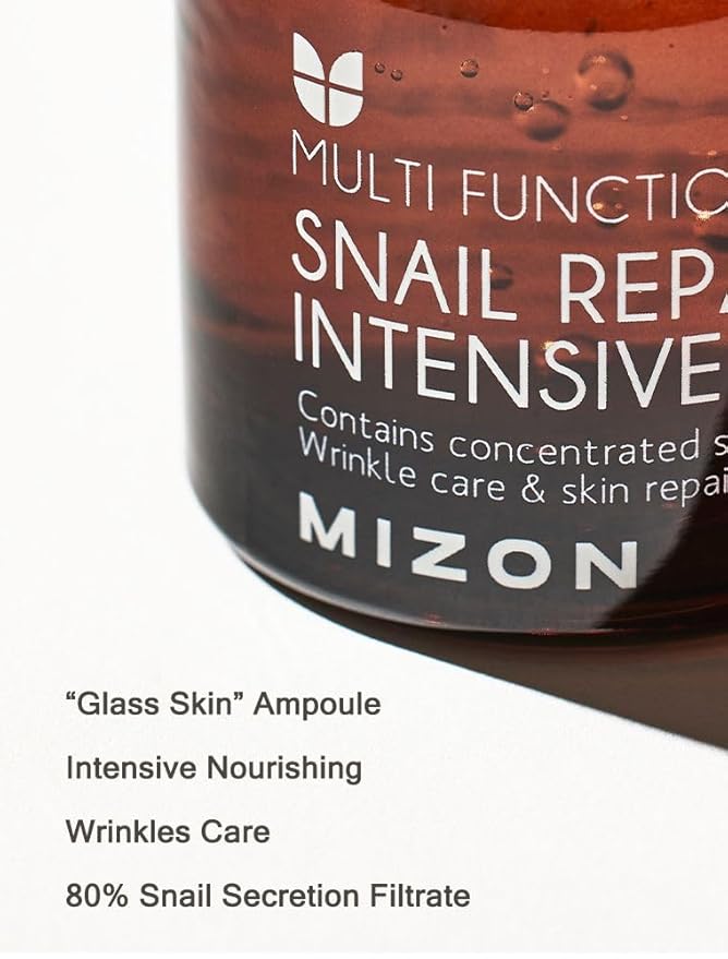 - Ampoule: After cleanser use Snail Repair Intensive Ampoule formulated with Mizon's famous snail filtrate. 80% high concentration of snail mucin extract that provides efficient total care, regenerating the skin and solving complex skin