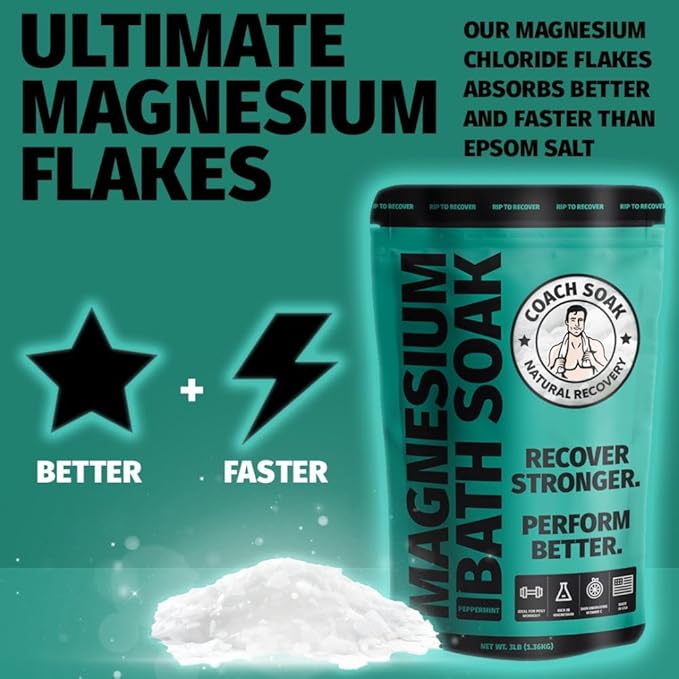 Coach Soak Recovery Bath Soak - Alternative to Epsom Salt Bath Soak - Fast-Absorbing Pure Magnesium Flakes with 21 Minerals, Bath Salts & Essential Oils - 48 oz, Cooling Peppermint