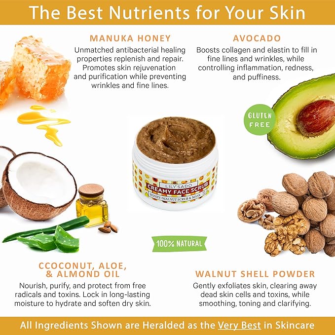 - 🍯 MANUKA HONEY, WALNUT & 5 MOISTURIZING OILS - This spa-quality, exfoliating scrub combines the antioxidant powers of MANUKA HONEY, COCONUT & AVOCADO with nourishing and hydrating oils from RAPESEED, SUNFLOWER, ORANGE, LEMON & ALMOND. Natural WALNUT SHELLS gently buff away dead skin cells, leaving your skin smooth, radiant & bouncy-soft. VITAMINS C, B5 + E protect skin from daily stressors, while boosting collagen to plump skin, fill in fine lines & wrinkles, and enhance texture.
