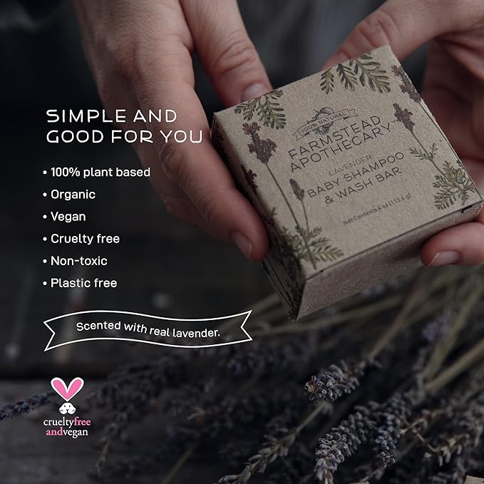 - BABY SHAMPOO & WASH BAR LAVENDER - Our Baby Shampoo Bar doubles as a Body Wash to have your babies hair and body feel clean and purified by nature's natural ingredients. Our zero waste bar is plastic free, formulated for sensitive skin, made with 100% plant based, vegan, cruelty-free, and organic & non-GMO ingredients. This bar gives more uses than leading liquid baby shampoos and is the perfect eco-friendly alternative.