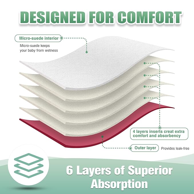 - Absorbent and Soft Insert: Inserts are made of 4 layers fibre, the strong absorbent material with breathability and softness is gentle on your baby’s bottom, keep your baby comfortable and happy; The inner suede cloth touches baby, and wicks moisture away from baby's bottom to the insert