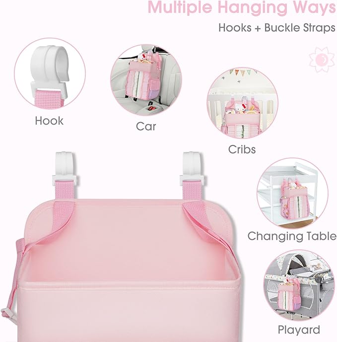 - Multiple Hanging Way- Besides 2 C-clip hook onto all playard frames, this hanging diaper organizer has 2 extra adjustable buckle straps for modern cribs with thicker bar, dresser changing station, pack 'n play and even your car; So good baby stuff for newborn