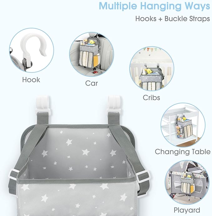 - MULTIPLE HANGING WAY- Besides 2 C-clip hook onto all playard frames, this hanging diaper organizer has 2 extra adjustable buckle straps for modern cribs with thicker bar, dresser changing station, pack 'n play and even your car; So good baby stuff for newborn