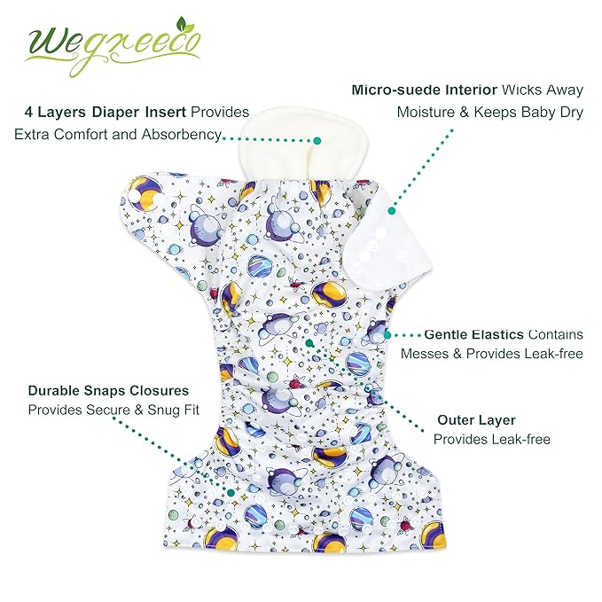 - One Size Adjustable Diaper: Three rows of adjustable snaps to allow for a small, medium, large size in one diaper; Usually fit zero-two years' baby; If you are looking for a pocket diaper to last through your baby’s infancy, toddlerhood and even future babies; Wegreeco baby diapers grow with your baby