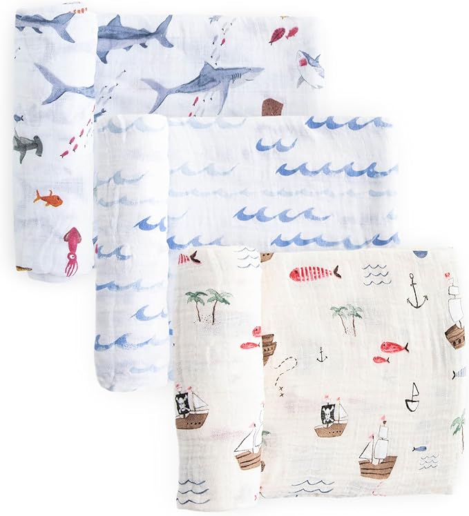 Little Unicorn Premium Muslin Swaddle Blanket 3 Pack | for swaddling, Play, Nursing & More | Giftable Set of 3 (Shark 2)
