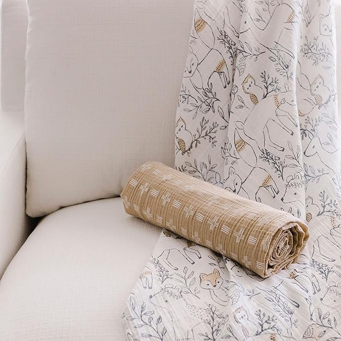 Crane Baby 100% Cotton Muslin Swaddle Blankets, Set of 2, 47" x 47", Boho Woodland Baby, Forest Animals Swaddle, Neutral Baby Items