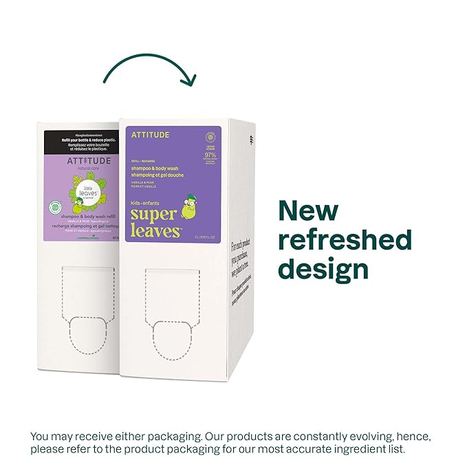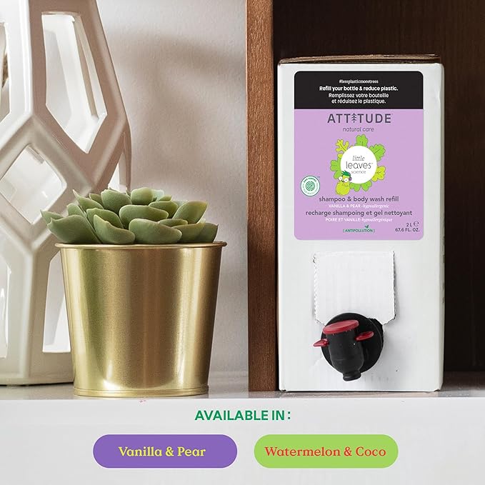 ATTITUDE Shampoo and Body Wash for Kids, EWG Verified Hair and Body Cleanser, Dermatologically Tested Soap, Plant and Mineral Based Bath Products, Vegan, Bulk Refill, Vanilla and Pear, 67.6 Fl Oz