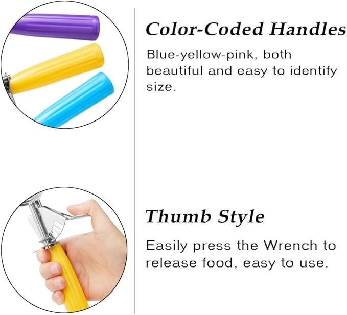 - PRETTY, CLEAN EASILY, IDEAL GIFT – There are 3 different color handle, blue-yellow-purple, both beautiful and easy to identify size. Easily clean, hand wash and dishwasher is also safe. The disher scoop set are ideal gift for engagement, anniversary, birthday, hostess and housewarming too.