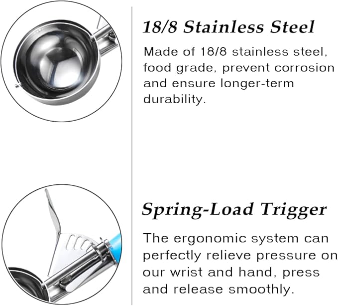 - ERGONOMIC TRIGGER SYSTEM, SQUEEZE SMOOTHLY – The ice cream scoop with trigger can perfectly relieve pressure on our wrist and hand, and squeeze to easily release cookie dough, without great effort. The cookie dough scoop set make our baking so much enjoyable.