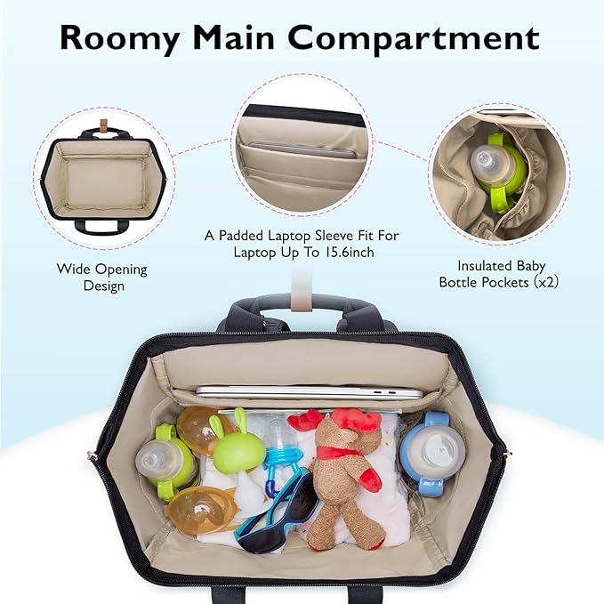 - Breast Pump Backpack for Working Mom: A detachable divider in the main compartment to separate the breast pump and other items. As a large-capacity mommy bag, the main compartment also has two insulated baby bottle pockets and a padded laptop sleeve fit for laptops up to 15.6 inches.