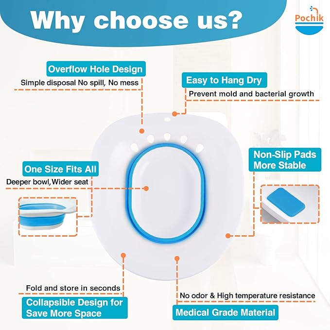 - Enjoy the Ultimate Ease - Pochik upgraded WIDER SEATING AREA fits your hips better for a more comfortable and safe sitz bath experience. Deeper Bowl holds more water, you can enjoy a soothing sitz bath longer.