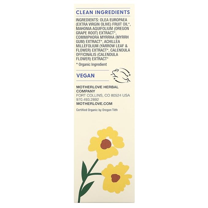 - Clean Ingredients: Extra virgin olive oil, Oregon grape root, myrrh gum, yarrow herb, and calendula flower. All natural and organic. Nothing else.