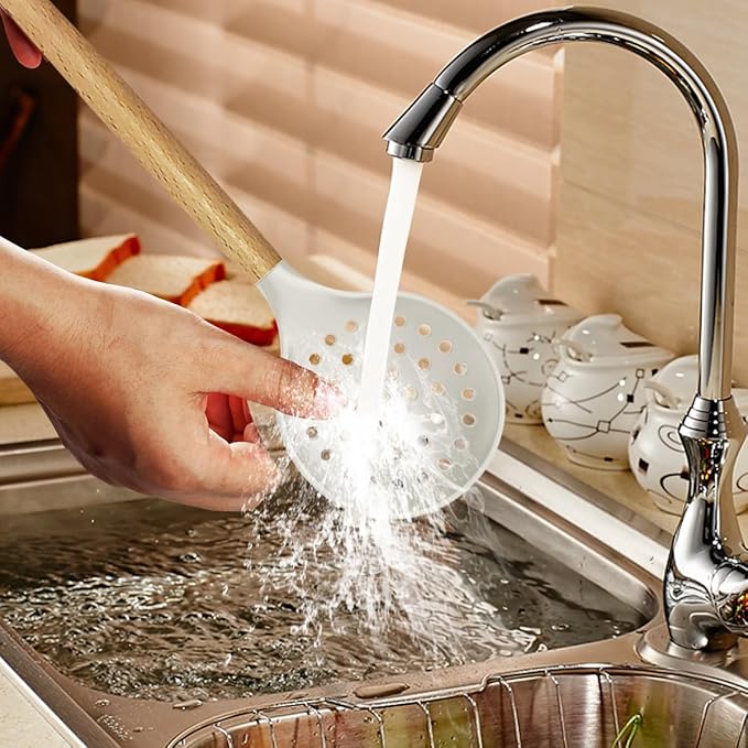 - HEAT RESISTANT & DURABLE: Our silicone kitchen utensils set features upgraded thickened silicone, enhancing durability and elasticity for a smoother cooking experience. Withstands up to 446°F (230°C) without melting or warping, retaining shape even after frequent use. Soft, thick heads protect cookware from scratches, suitable for nonstick pans and daily high-heat cooking