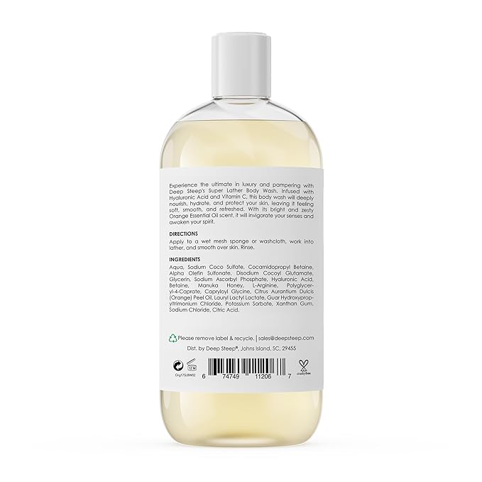 Deep Steep Super Lather Body Wash, Orange, 17 oz – Hydrating Shower Gel with Hyaluronic Acid, Manuka Honey, & Orange Essential Oil – Vegan, Clean Beauty, Clean & Refreshed Skin