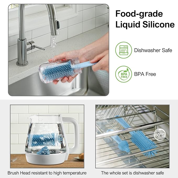 - 【Food Grade Patented Product】The upgraded baby bottle cleaner kit is made of food-grade liquid silicone material, durable and BPA free.The soft bristles will not fall off and wear small,and will not scratch the items being cleaned.Except for the soap dispenser,the entire set is dishwasher safe.The silicone brush head is detachable and can be boiled, but the handle cannot be boiled