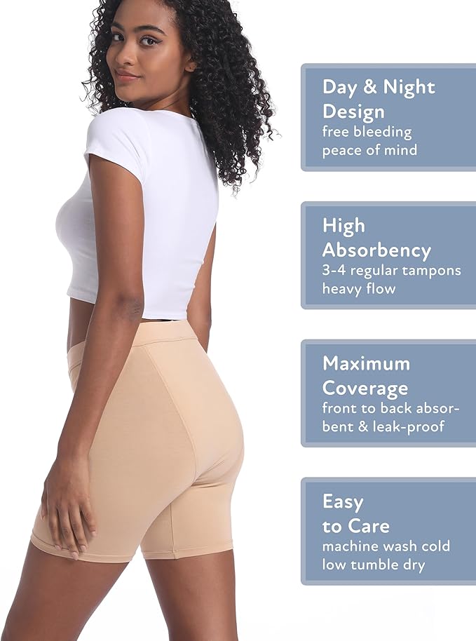• Seeking usage and care tips? Our 5-inch period shorts underwear is perfect for medium to heavy flow, equivalent to the absorbency of 3 to 4 tampons. Its versatile design caters to day, night, postpartum, and light incontinence needs. Cleaning is a breeze: simply rinse, machine-wash cold, and hang dry or tumble dry on extra-low. Avoid high-temperature dryers, bleach, and fabric softener to maintain the longevity of your underwear.