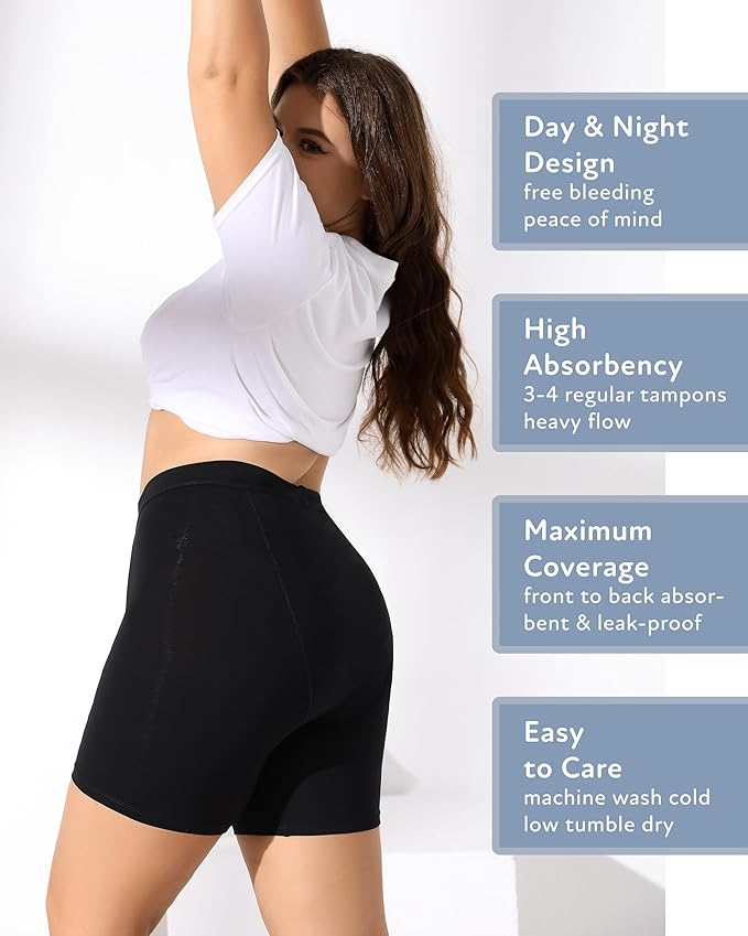 - Seeking usage and care tips? Our 5-inch period shorts underwear is perfect for medium to heavy flow, equivalent to the absorbency of 3 to 4 tampons. Its versatile design caters to day, night, postpartum, and light incontinence needs. Cleaning is a breeze: simply rinse, machine-wash cold, and hang dry or tumble dry on extra-low. Avoid high-temperature dryers, bleach, and fabric softener to maintain the longevity of your underwear.