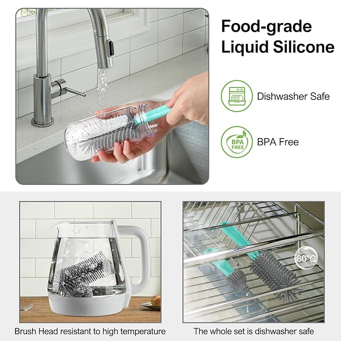 - 【Food Grade Patented Product】The upgraded baby bottle cleaner kit is made of food-grade liquid silicone material, durable and BPA free.The soft bristles will not fall off and wear small,and will not scratch the items being cleaned.Except for the soap dispenser,the entire set is dishwasher safe.The silicone brush head is detachable and can be boiled, but the handle cannot be boiled