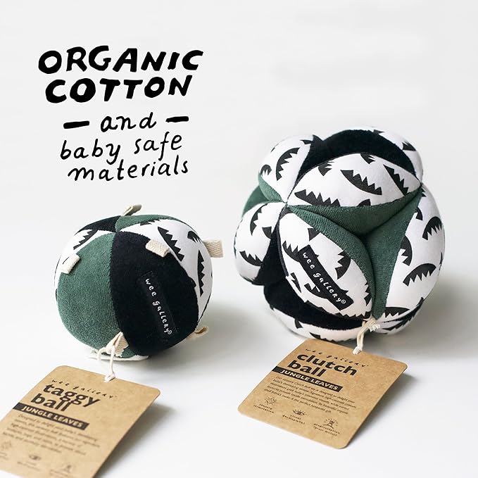 Wee Gallery Taggy Ball with Rattle, Soft Sensory Baby Toy, Sensory Ball with Organic Cotton Fabric, Little Tags & Gentle Rattle for Tummy Time, Grasping & Developmental Play, Jungle
