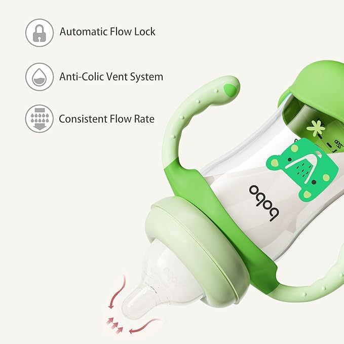 - Our baby bottles also come with a unique gravity ball design that allows your baby to drink at will. The bottom is equipped with a thick rubber cover to make the bottle more stable. Removable handle makes it easier for your baby to hold.
