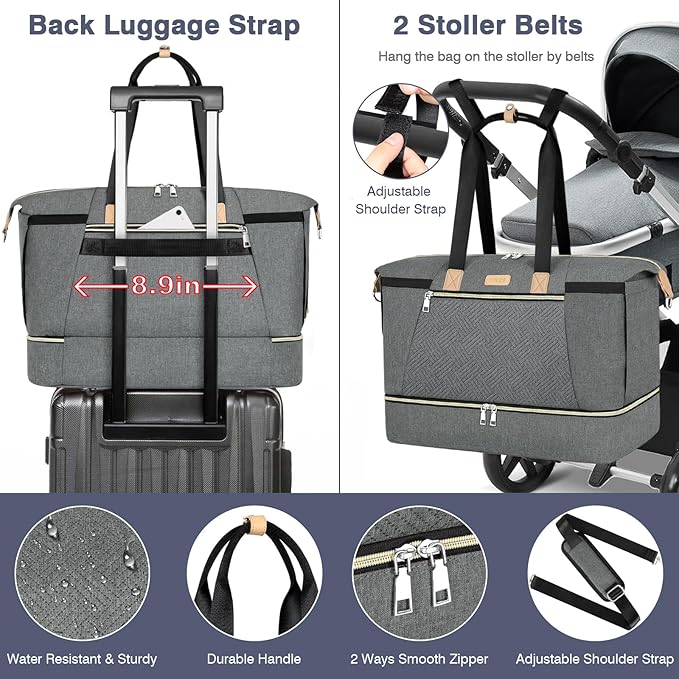 - Convenient Carry on Diaper Bag: Our large diaper bag equipped with an adjustable shoulder strap and thickened support, easily converts from a shoulder bag to a cross-body bag. This diaper bag tote is equipped with 2 baby stroller straps, you can hang the mommy bag on the stroller and free your hands. And a handy luggage sleeve at the back could slide over the carry-on luggage handle easily.The tote bag is a great choice for parents who need a diaper bag for traveling with their baby.