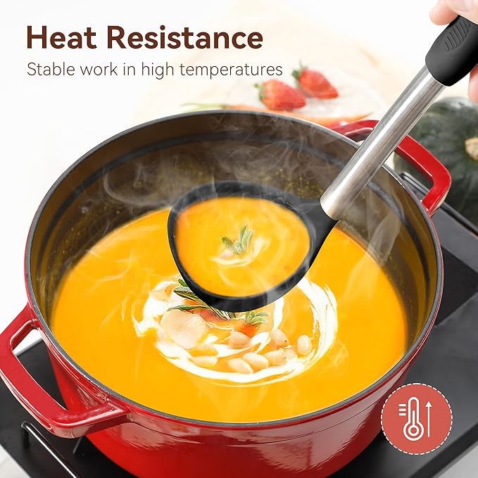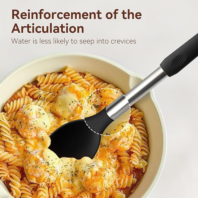 - LARGE STAINLESS STEEL HANDLES KITCHEN UTENSILS: Our kitchen utensils are designed in large sizes, not those ordinary kitchen utensils that look like toys. Silicone heads combined with high quality stainless steel handles ensure lightweight and durable. The thickened anti-scald silicone cover on the handle prevents slipping and also prevents the cook's hand from getting burned. Strong welding makes the silicone head durable and hard to come off even after long time use