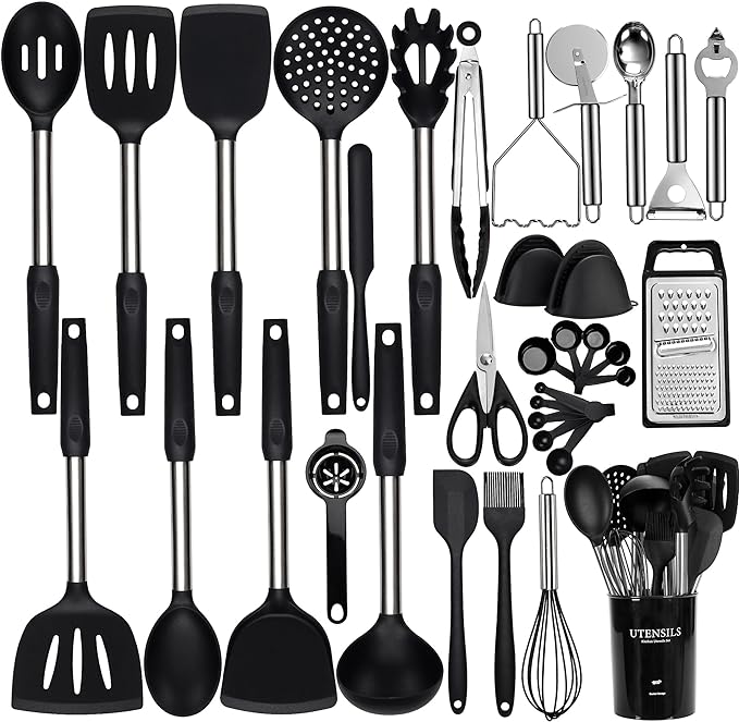 Silicone Cooking Utensils Set, NCUE 35 Pcs Kitchen Utensils Set with Holder, with Stainless Steel Handle Spatula Set, Spoons, Pasta Server, Cheese Grater, Masher, Scissors, Dishwasher Safe (Black)