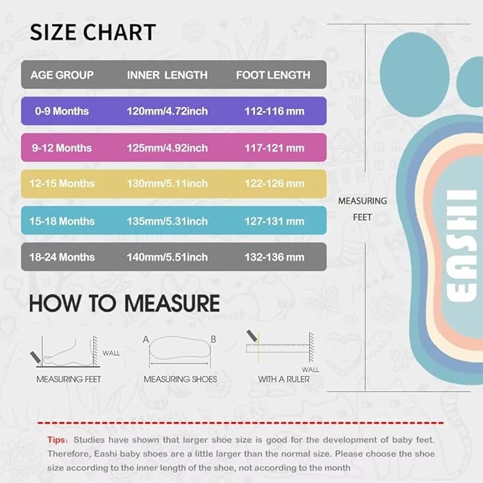 - Five Size for Choice : Fits up to 0-9 Month (size 3.5), 9-12 Month (size 4.5), 12-15 Month (size 5), 15-18 Month (size 6), 18-24 Month (size 6.5). Very soft, comfort and stretchy. Easy to clean, hand & machine washable.