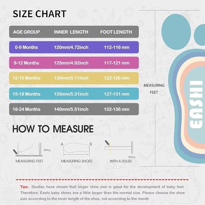 • Five Size for Choice : Fits up to 0-9 Month (size 3.5), 9-12 Month (size 4.5), 12-15 Month (size 5), 15-18 Month (size 6), 18-24 Month (size 6.5). Very soft, comfort and stretchy. Easy to clean, hand & machine washable.