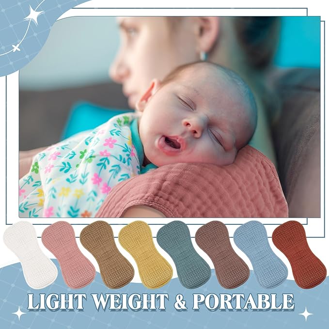 - Package Includes: you will receive 8 pieces of muslin burp cloths in different colors, enough quantity to meet your baby's use and replacement needs; Each burp cloth is about 10 x 20 inches/ 25 x 50 cm, large enough to use