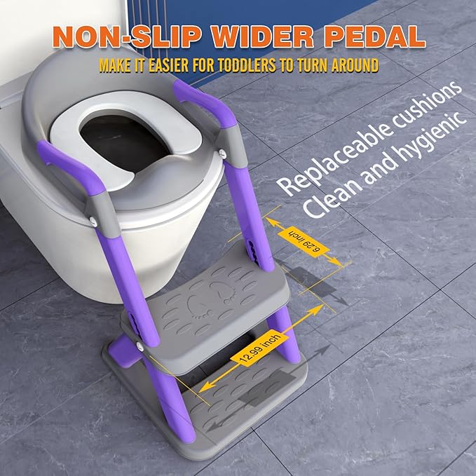 - SAFE AND NON-SLIP: This potty seat is made of safe PP material with a maximum load capacity of 75 kg (165 lbs). The non-slip rubber pad is designed to effectively prevent children from slipping. The widened ladder makes it easy for babies to turn around.