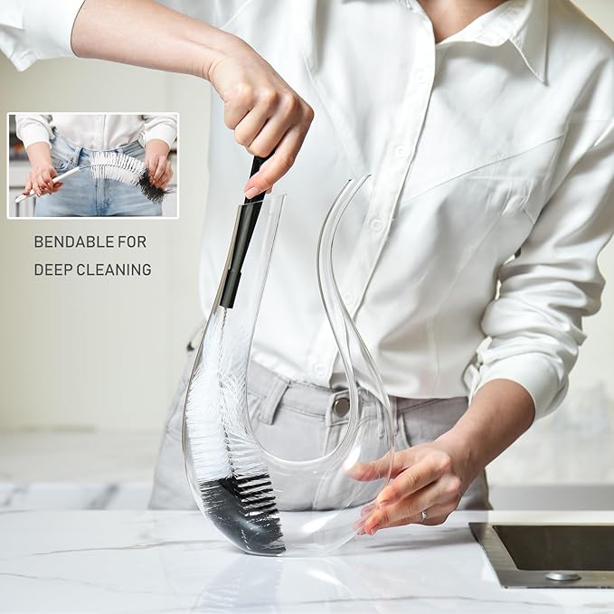 - SPECIAL DESIGN BOTTLE BRUSH - 16" extra long cleaning brush for narrow neck bottle easily reaches into long narrow neck wine & beer bottles and hummingbird feeder. 15" water bottle brush with generous bristles on the top allows cleaning Stanley, Simple modern and all standard & wide neck bottles, baby bottles, tumblers and more.