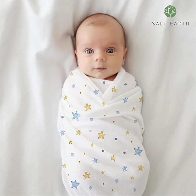 Salt Earth GOTS Certified 100% Organic Cotton 2-Layered Swaddle Baby Blanket, 4 Pack, 47"x 47" Receiving Blankets for Swaddling, Wrap for Boy & Girl, Newborn Baby Essentials, Registry (Solids & Stars)