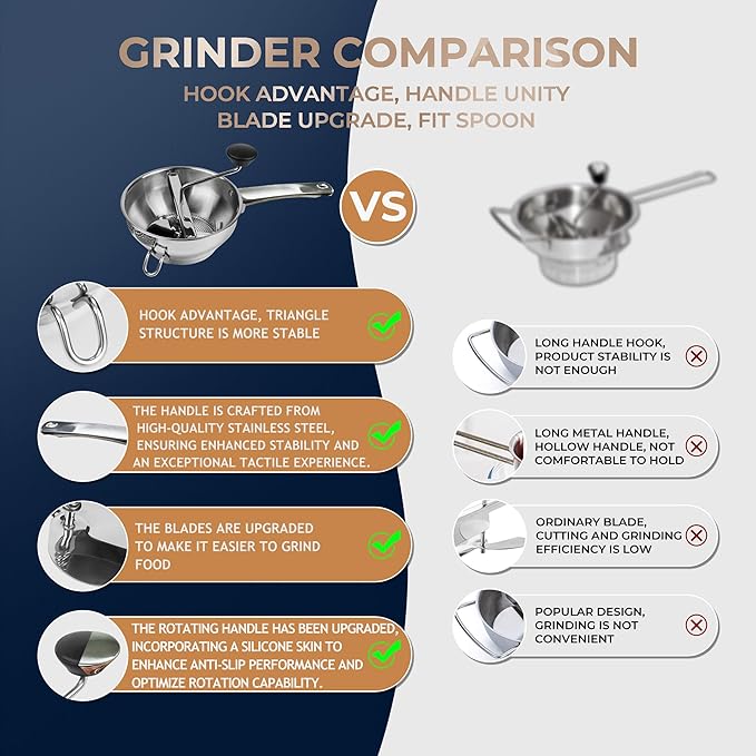 - ✅【Dual hook design】Our food mills are dual hook design, they and the handle form a stable triangle structure, so that the food grinder firmly attached to the mixing bowl.And they use a unified handle and crank, which are covered with soft silicone to play a non-slip role.Allows you to grind food steadily and easily.