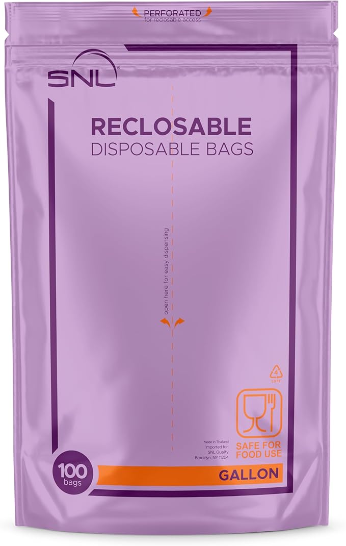 Gallon Food Bags by SNL -100 Pack- Leak-Proof, Clear, Write-On Block, Reclosable, Disposable Storage Bags, Double Seal Zippers with Clicking Noise Zip Confirmation, Stand-Alone Gusset, Easy Dispensing