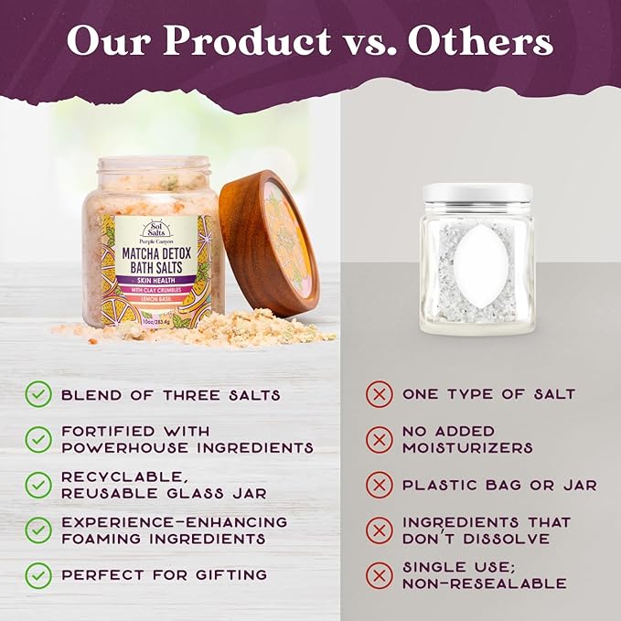 - 𝐂𝐥𝐞𝐚𝐧𝐬𝐞 & 𝐑𝐞𝐣𝐮𝐯𝐞𝐧𝐚𝐭𝐞: Immerse yourself in the purifying embrace of Purple Canyon SolSalts Matcha Detox Bath Salts. Our bath soak combines the detoxifying powers of Dead Sea Salt, Epsom Salt, and Pink Himalayan Sea Salt with a premium salt blend, enhanced with Clay Crumbles, ensuring a rejuvenating experience.