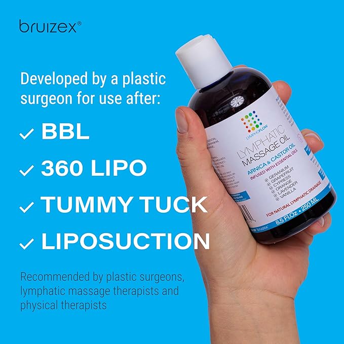 Lymphatic Drainage Massage Oil with Arnica & Cold Pressed Castor Oil I Post Surgery Recovery & Post Liposuction, BBL, 360 Lipo, Tummy Tuck I Fibrosis Treatment, Body Detox I 8.5 Oz by Bruizex