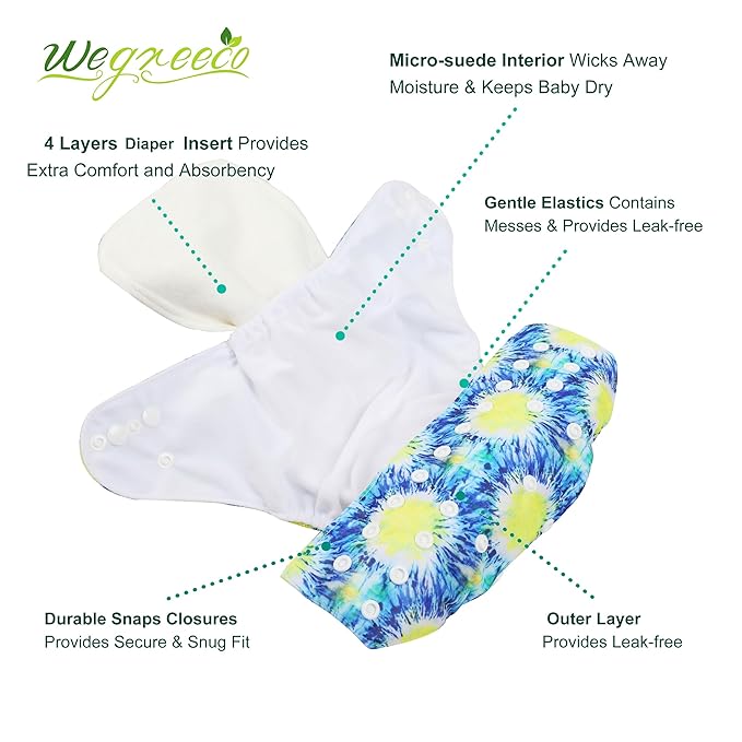 wegreeco Cloth Diapers 6 Pack with 6 Inserts & 1 Wet Bag, Washable Cloth Diapers for Babies, One Size Adjustable Reusable (Tie-dye)