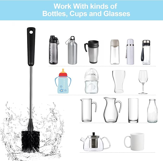 - The bottle cleaning brush can be easily fitted into various water bottles, thermos cups, travel mugs, baby bottles, coffee mugs & cups, vacuum flasks, narrow containers, you can also use this bottle washer brush to washing your kitchen dishes, sink, pots & pans, or other household cleaning purposes.