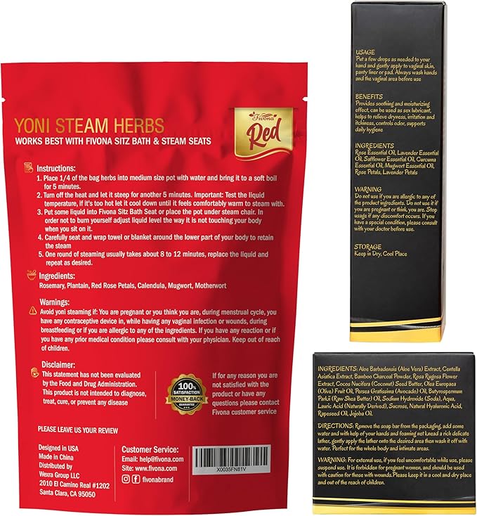 - PREMIUM 4 IN 1 FEMININE YONI CARE SET - The complete set is a luxury product made with a goal of ensuring the maximum satisfaction in mind. It contains a seat, an organic steaming herbs, all natural feminine oil blend, and herbal soap