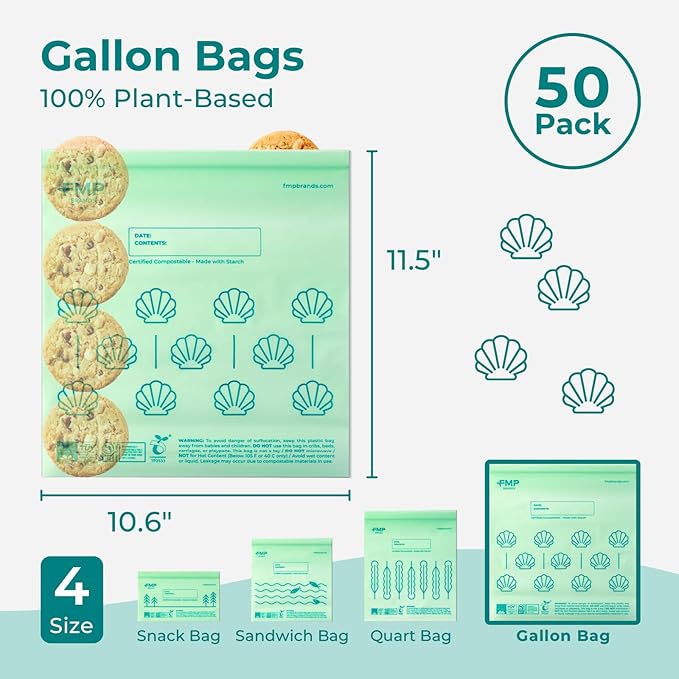 Fit Meal Prep 50 Pack 100% Compostable Food Storage Bags, 1 Gallon Freezer Bags, 10.6 x 11.5" Resealable Bag for Vegetables, Meat, Fruits, ASTM D6400, US BPI & EU OK Compost Certified