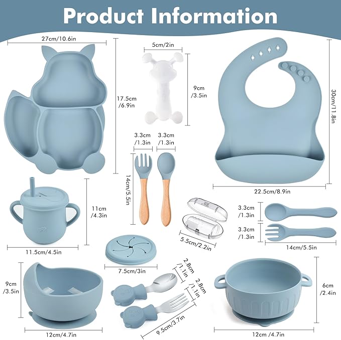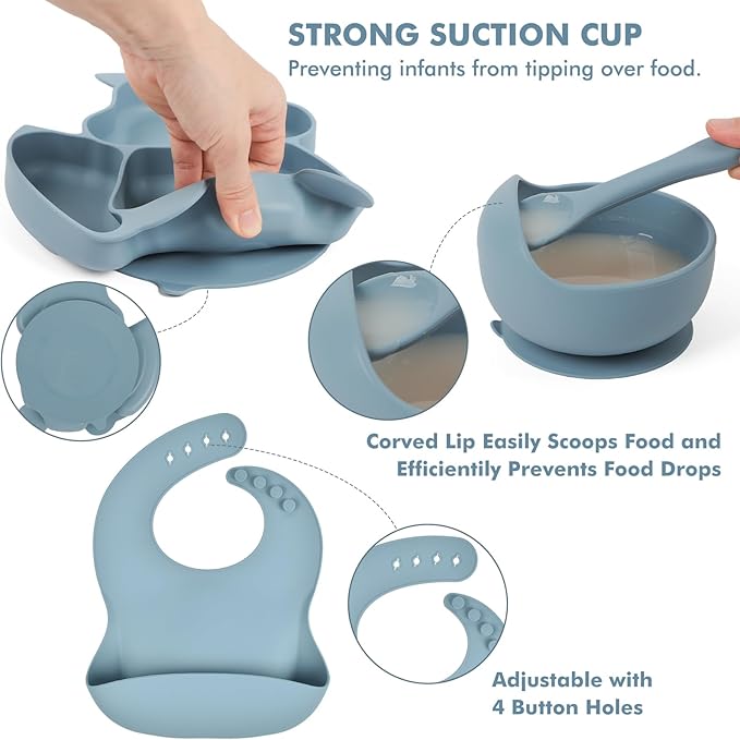 - Silicone baby feeding set,the perfect silicone tableware set for training your baby to self-feed,a complete range of tableware suitable for feeding babies after weaning and for self-feeding toddlers,The feeding set contains a plate with suction cup and two bowls with suction cups, as well as a training cup, bib, finger brush and a variety of forks and spoons