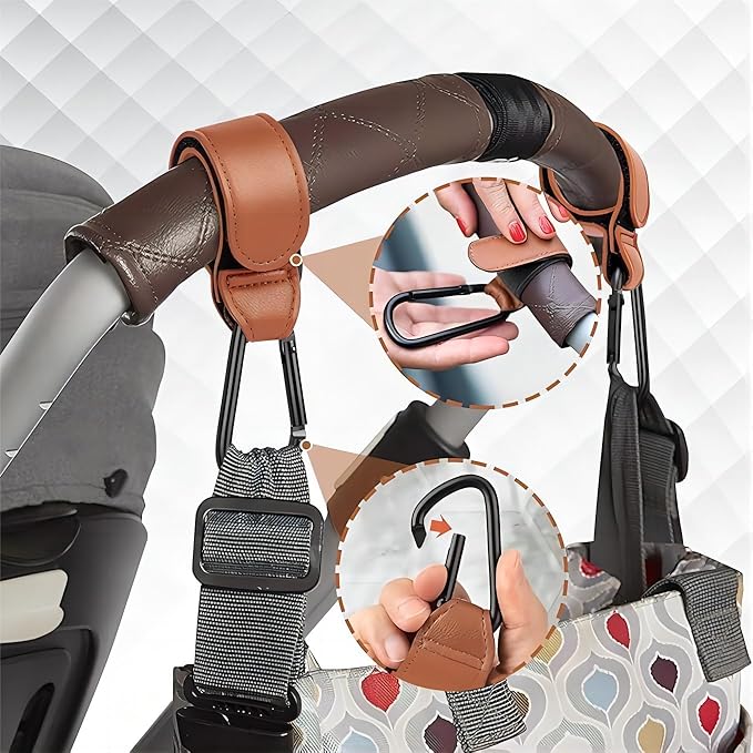 4PCS Stroller Hook Accessories, Multipurpose Stroller Bag Hooks, Leather Stroller Clips for Diaper Bags Pet Carts Grocery Shopping Bags(Black and Brown)