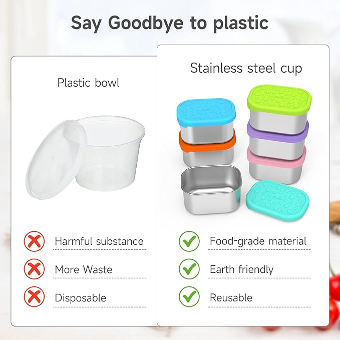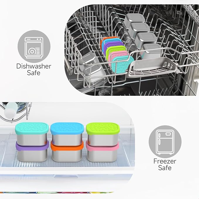 - Easy to Clean and Reuse: You can simply put the containers and lids on the top rack of the dishwasher and cleaning becomes a hassle-free task, saving both time and effort. The snack containers are reusable which can replace disposable food cups to reduce the impact on environment. They also can be stacked inside each other with the lids off when not in use, saving space in the drawer or cabinet.