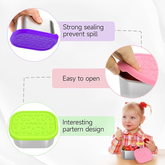 - Kid-Friendly Design: The cute patterns and vivid colors will increase your child's appetite. Different colors also help children get hand-eye coordination, fruit goes in one color and nut goes in another. The combination of the soft silicone lid and the handle is easy for children to open. It is great for independent kids. The premium containers for kids are made from food grade material and safe for your family members and environment.
