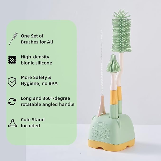 3-Pack Baby Silicone Bottle Brush Set, Bottle Cleaner, Bottle Brush with Storage Holder, Food Grade Silicone, Effortless Scrubbing, Baby Bottle Cleaning Brush (Green)