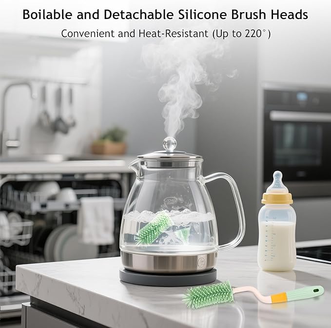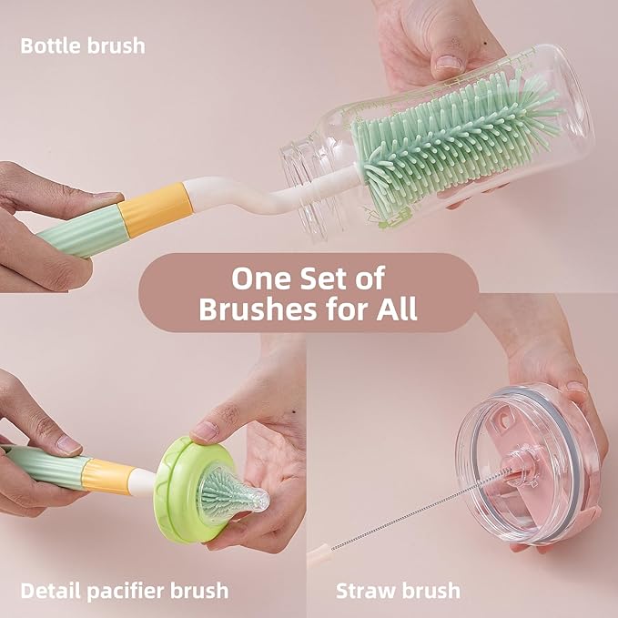 - Cute Stand Included - The set comes with a stand for basic storage. The base is also cute and great color to be placed in your kitchen. The brushes also have hooks for hanging storage, even if they are not drying out. This reusable bottle brush cleaner set is a good choice for daily and long-term use. This beautiful brush pack is also an ideal gift for new or expecting mums. It can be a wonderful addition to a gift basket or a thoughtful present on its own. Attention: Remove brush head for disinfection. Handle is heat-resistant up to 80°C